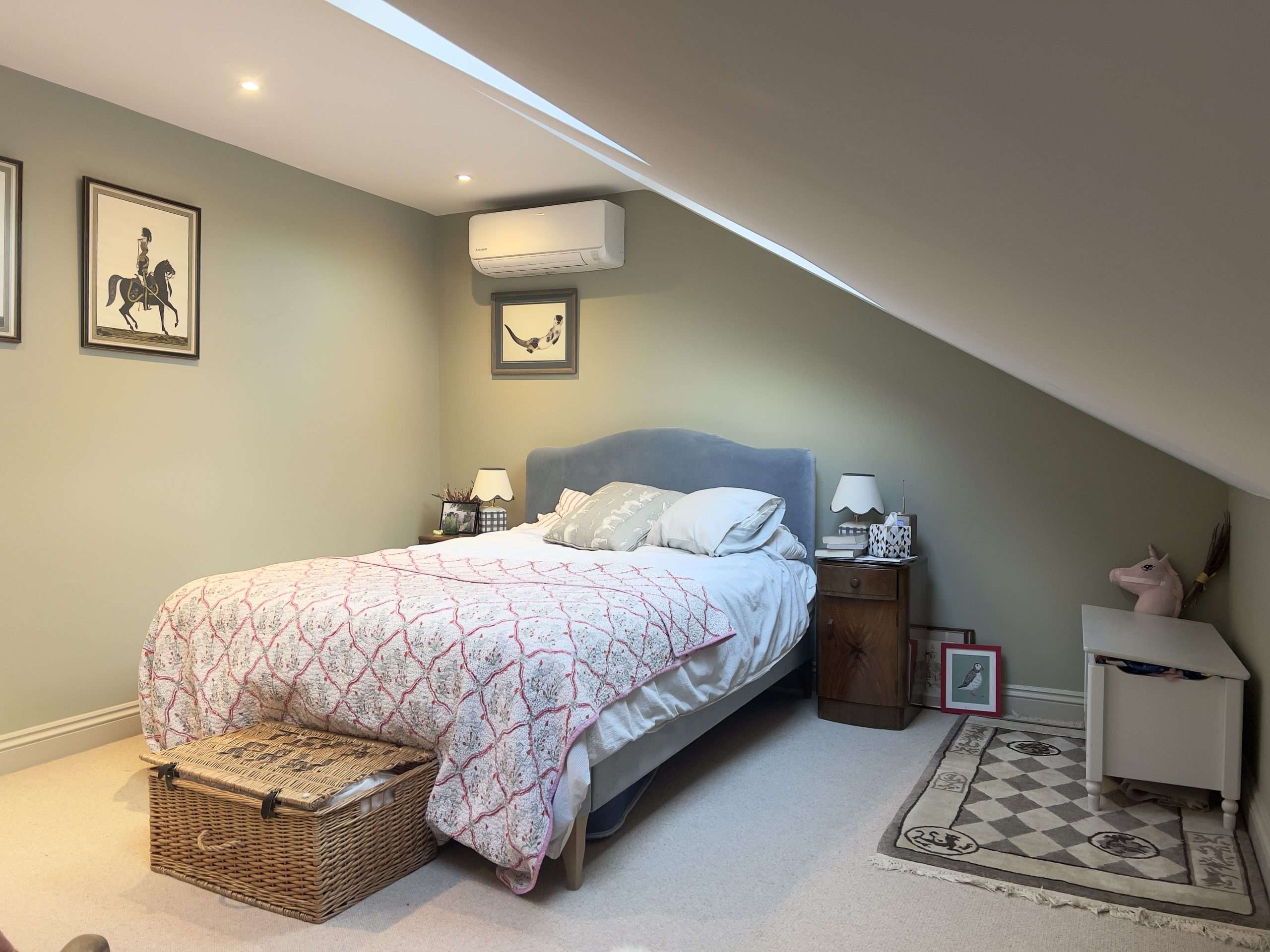 The newly added bathroom combines timeless Victorian-style sanitary ware with modern convenience. Highlights include a spacious walk-in shower framed by sleek glass panels, a high-level cistern toilet, and elegant traditional fixtures. A timber casement sash window enhances natural light and ventilation, adding both charm and practicality. The bathroom’s design showcases how classic aesthetics and modern functionality can work harmoniously in a loft conversion.