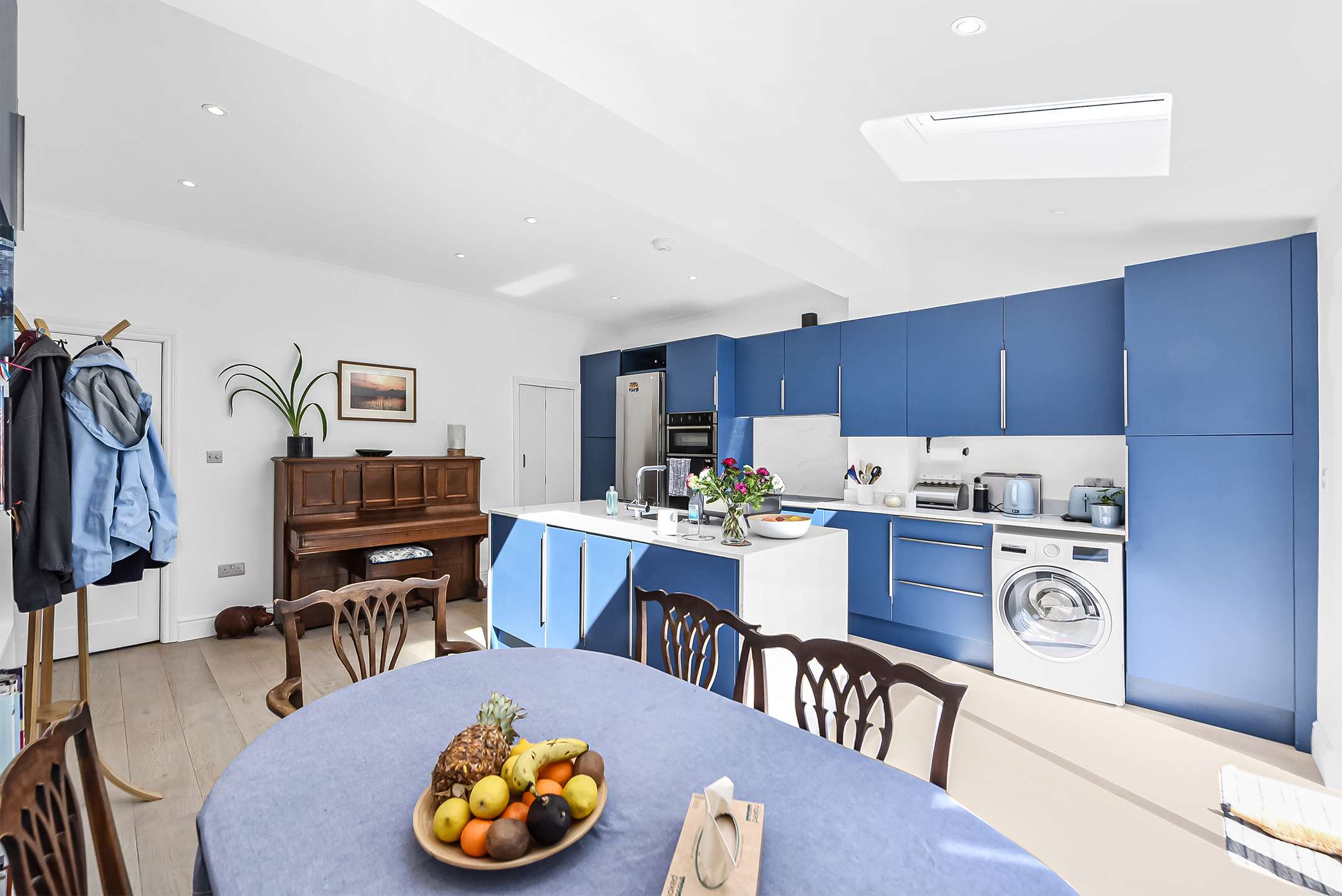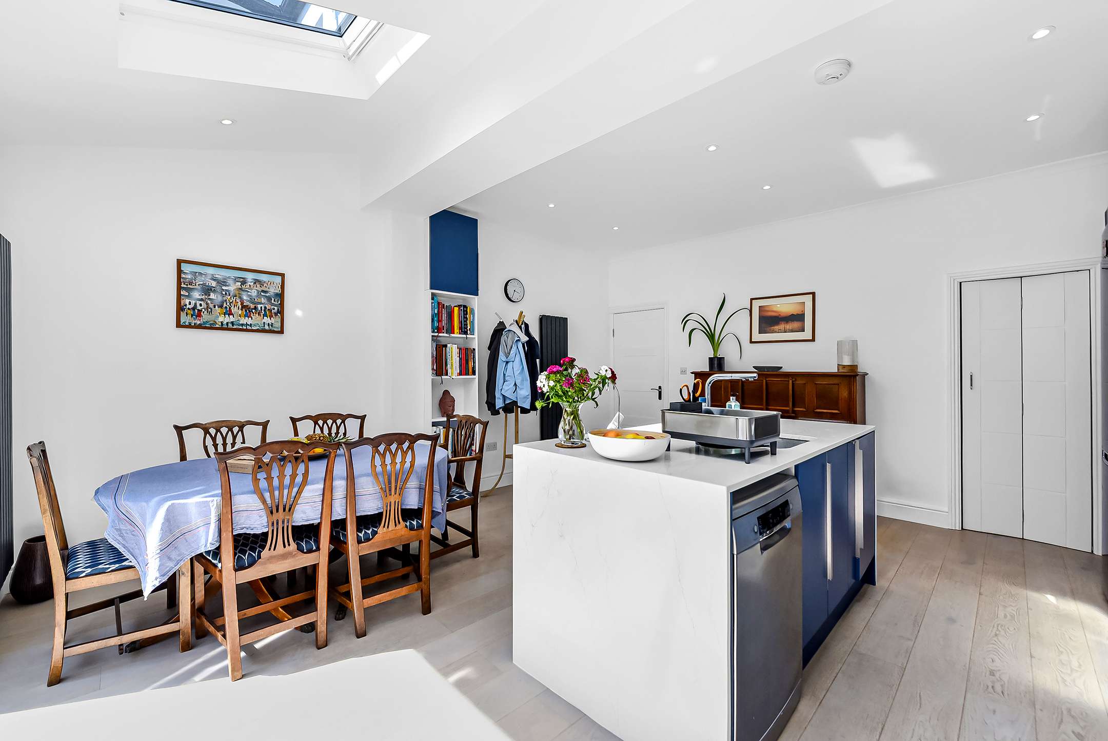 To ensure this rear kitchen extension in Finchley feels bright and airy, natural light was a priority throughout the design. A flat roof fitted with two Velux roof windows brings daylight into the heart of the room. At the rear, large aluminium sliding doors offer expansive garden views while drawing light deep into the interior.