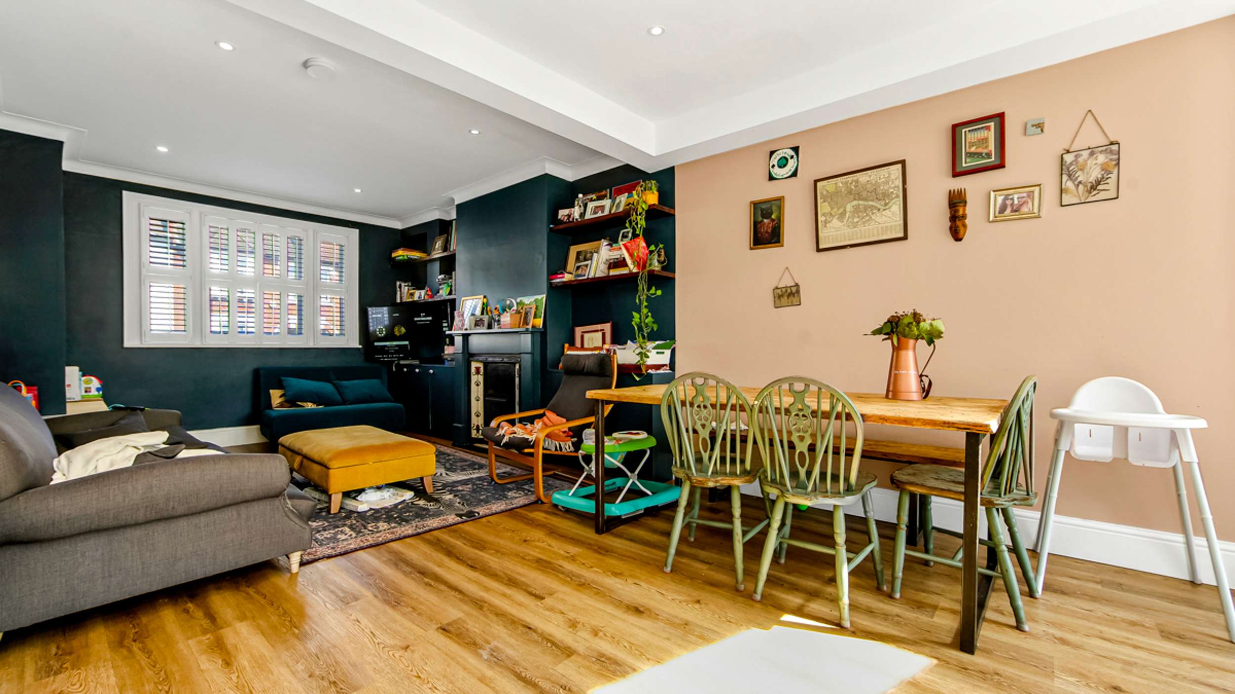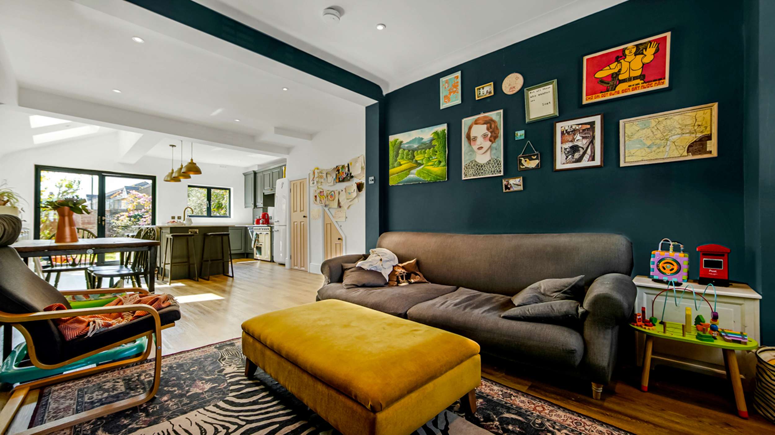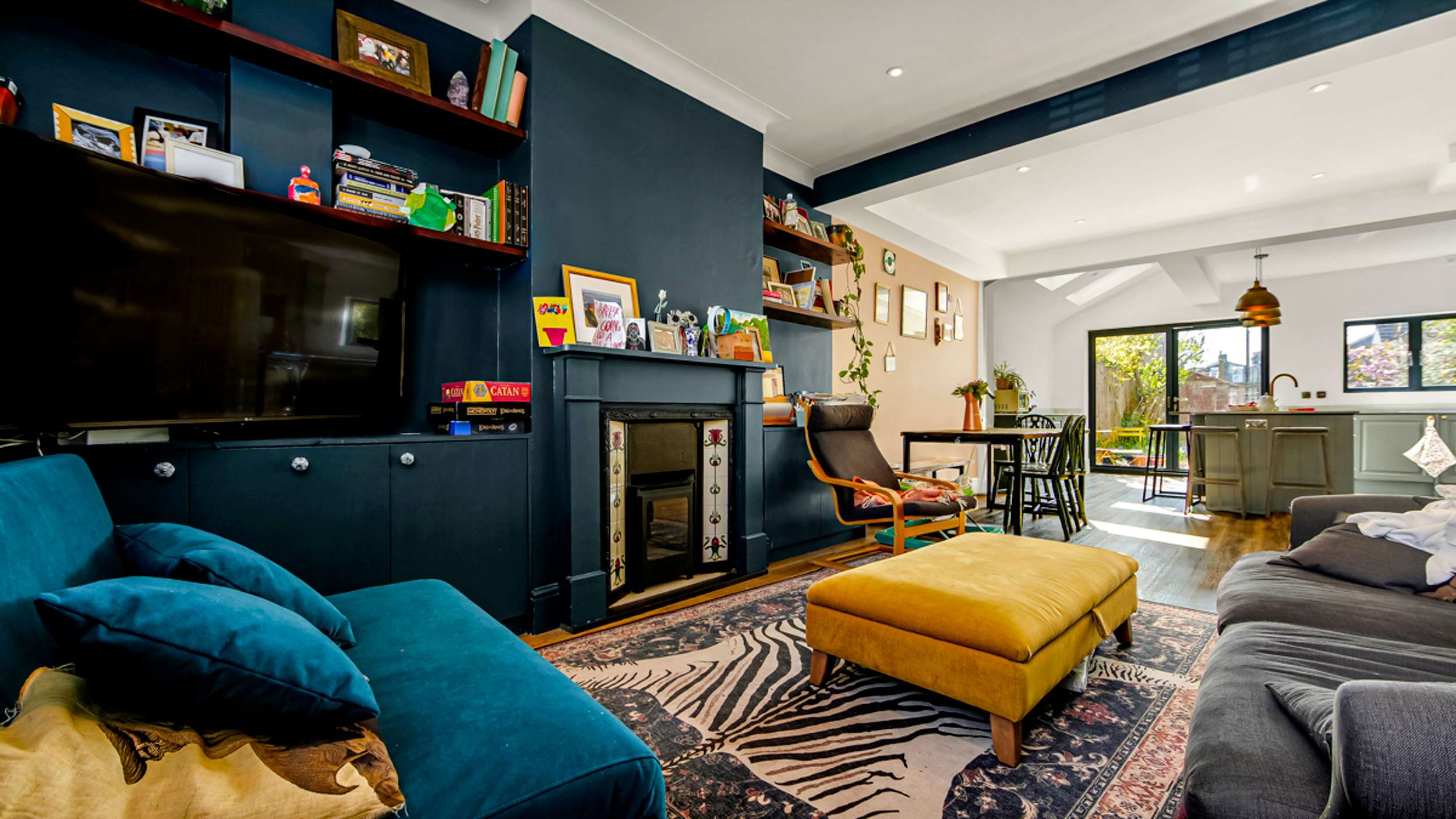 To complement the structural transformation, each area was thoughtfully styled. The rear dining space includes a blush pink feature wall and rustic wooden dining table, while the living room showcases navy blue tones and bespoke shelving. This attention to detail ensures a unified aesthetic throughout the home.