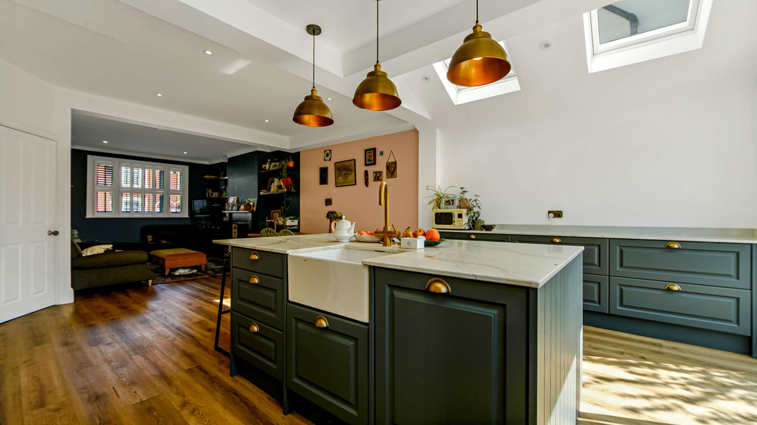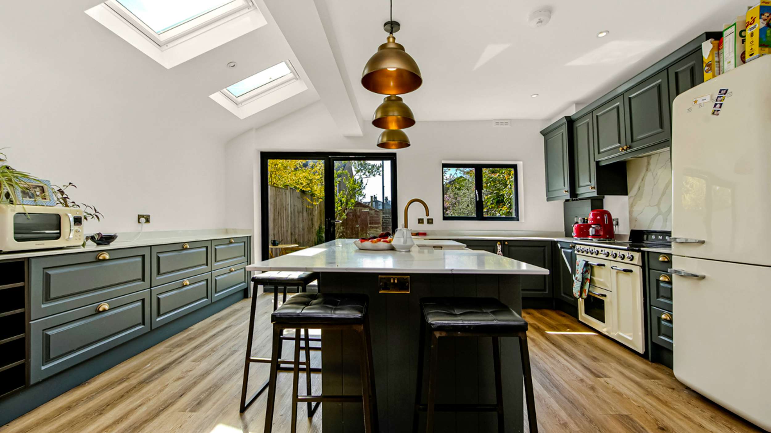 The new kitchen design blends traditional character with modern practicality. Featuring deep green shaker-style cabinets, brushed brass hardware, and a central island, the space is both functional and visually striking. The island serves as a social hub with ample storage, prep space, and a breakfast bar, enhancing the functionality of this Lewisham kitchen renovation.